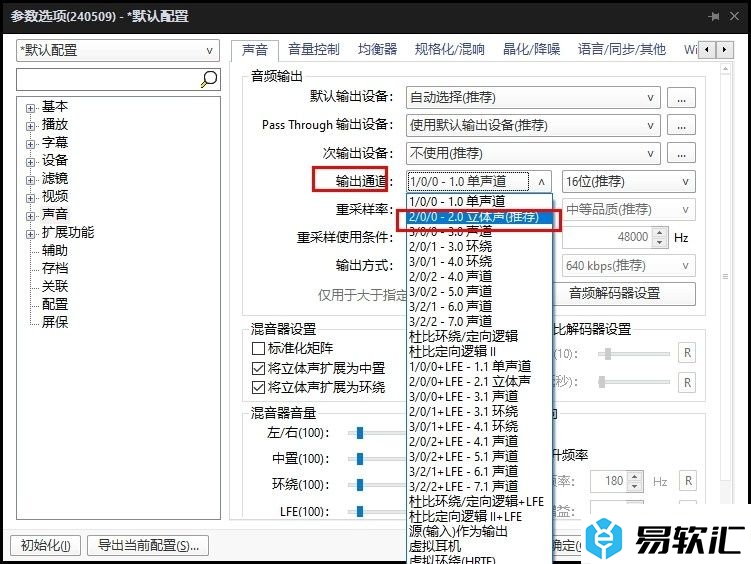 以上就是小编整理总结出的关于PotPlayer播放器设置立体声输出的方法,我们先点击打开PotPlayer播放器,然后再右键单击打开“选项”,接着在参数选项页面中打开声音选项,最后在声音设置页面中打开“输出通道”选项,再点击选择“立体声”选项即可,在感兴趣的小伙伴快去试试吧。