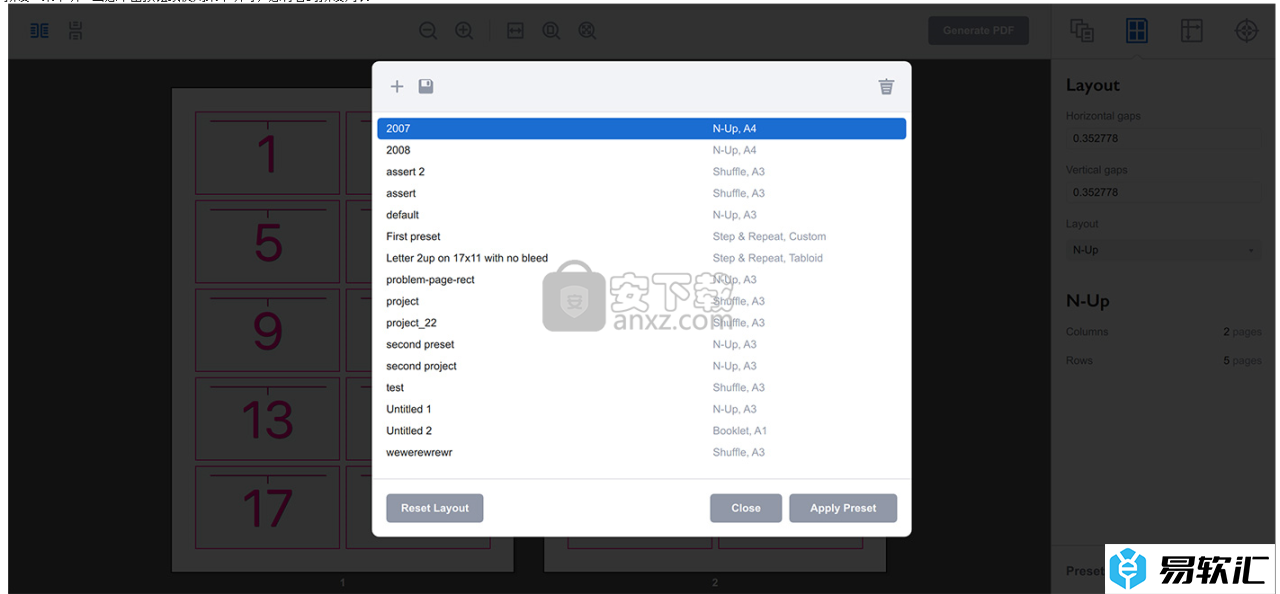 拼版向导会将当前版面保存到选定的预设中,以便您以后可以重新使用它。请注意,此操作无法撤消,旧的预设参数将被新值覆盖。其他选择预设列表中的另外两个按钮可让您删除所选的预设并将布局重置为默认设置: