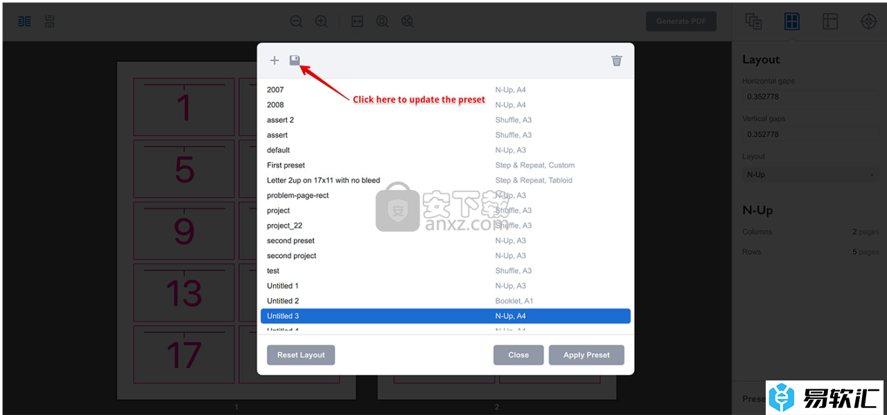 右面板右侧的面板有4个选项卡,您可以在其中配置拼版版式。它还在底部具有“ 预设”按钮,可用于保存和加载此类布局: