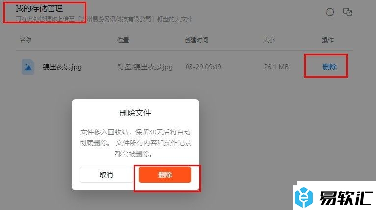 很多小伙伴之所以喜欢使用钉钉软件进行文件传输以及保存,就是因为钉钉软件能够自动保存我们聊天页面中上传的各种大型文件。有的小伙伴想要删除自己存储的大文件,但又不知道该在哪里找到文件并进行删除。其实我们只需要在钉钉页面中先点击打开“钉盘”,再在钉盘的菜单列表中找到并打开“我的存储管理”选项,接着在我的存储管理页面中找到需要删除的文件,最后点击删除选项即可。有的小伙伴可能不清楚具体的操作方法,接下来小编就来和大家分享一下钉钉云盘删除自己存储的文件的方法。
