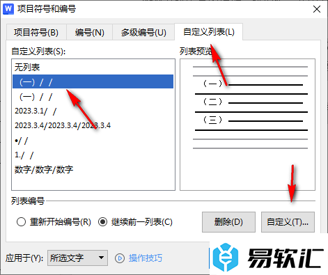 2.在打开的窗口中,我们将【自定义列表】选项点击打开,然后选择左侧的一种编号选项,再点击【自定义】。