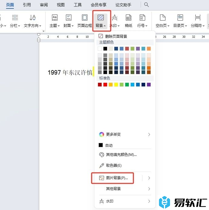 4.然后继续在页面选项卡中点击背景选项,在弹出来的下拉选项卡中,用户选择图片背景选项