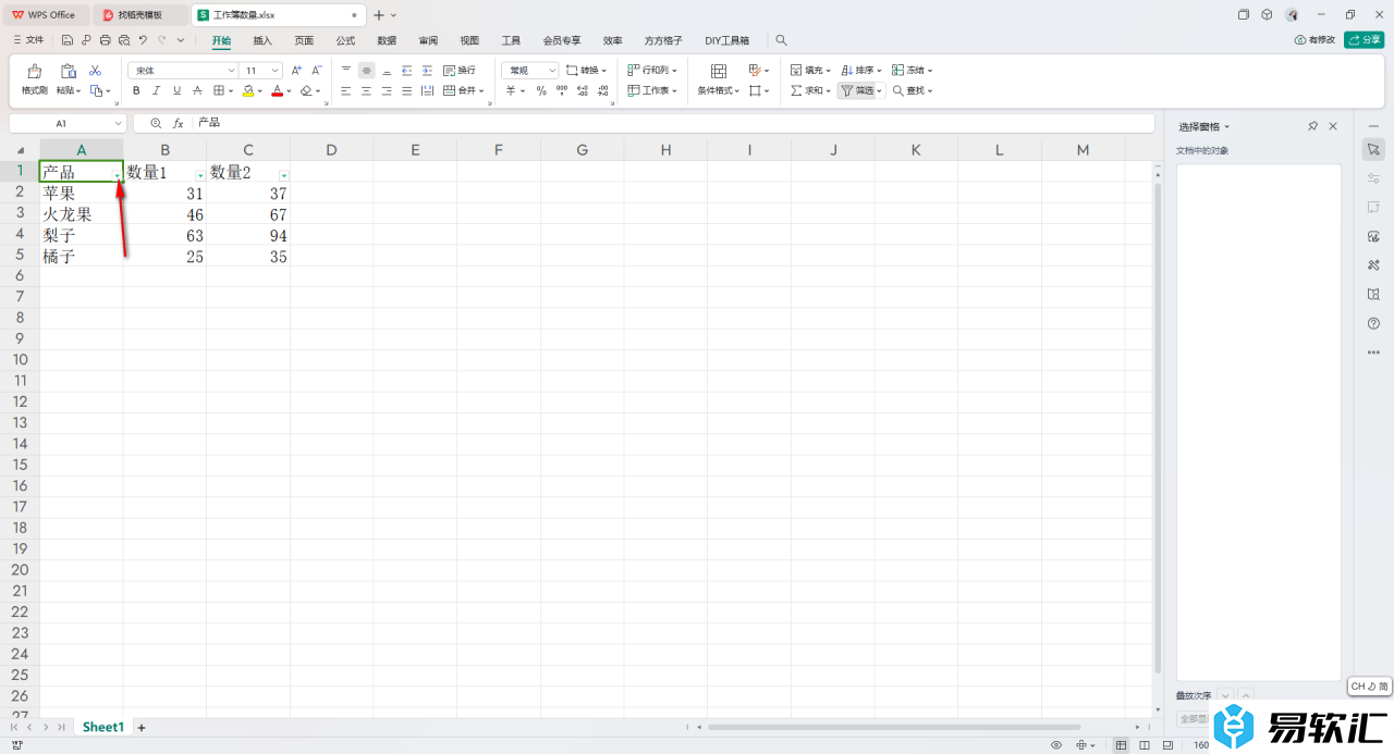 3.随后即可在数据标题的单元格中显示出一个三角形的下拉按钮,我们需要点击其中要进行筛选的那一列的下拉按钮。