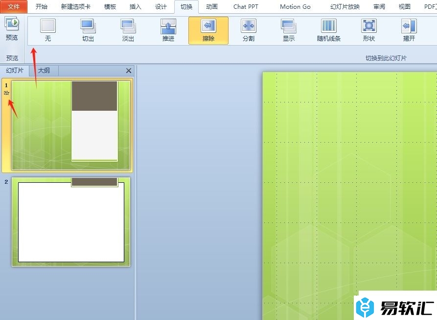 3.然后在页面上方的菜单栏中点击切换选项,将会显示出相关的选项卡,用户在切换到此幻灯片板块中选择动画效果即可解决问题