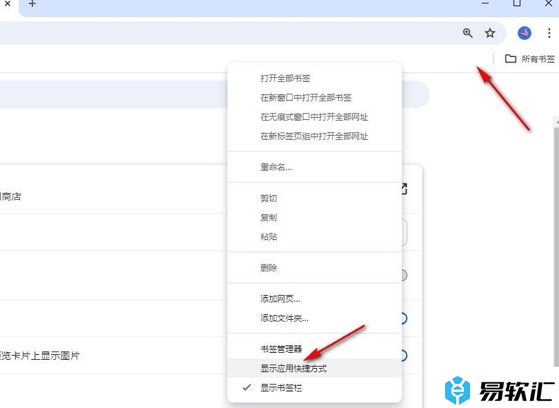 4、第四步,将书签栏显示在谷歌浏览器中之后,我们再右键单击书签栏,然后在菜单列表中找到并点击“显示应用快捷方式”选项