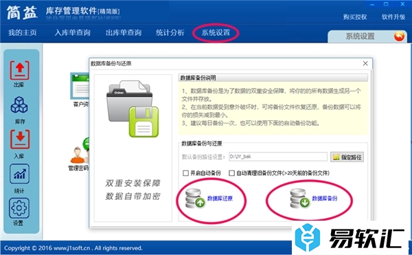 【数据库备份】是为了数据的双重安全保障而设计的辅助工具,当你的库存软件数据误删除或意外出问题时,可以通过【数据库还原】功能来快速的恢复数据到备份时的状态。