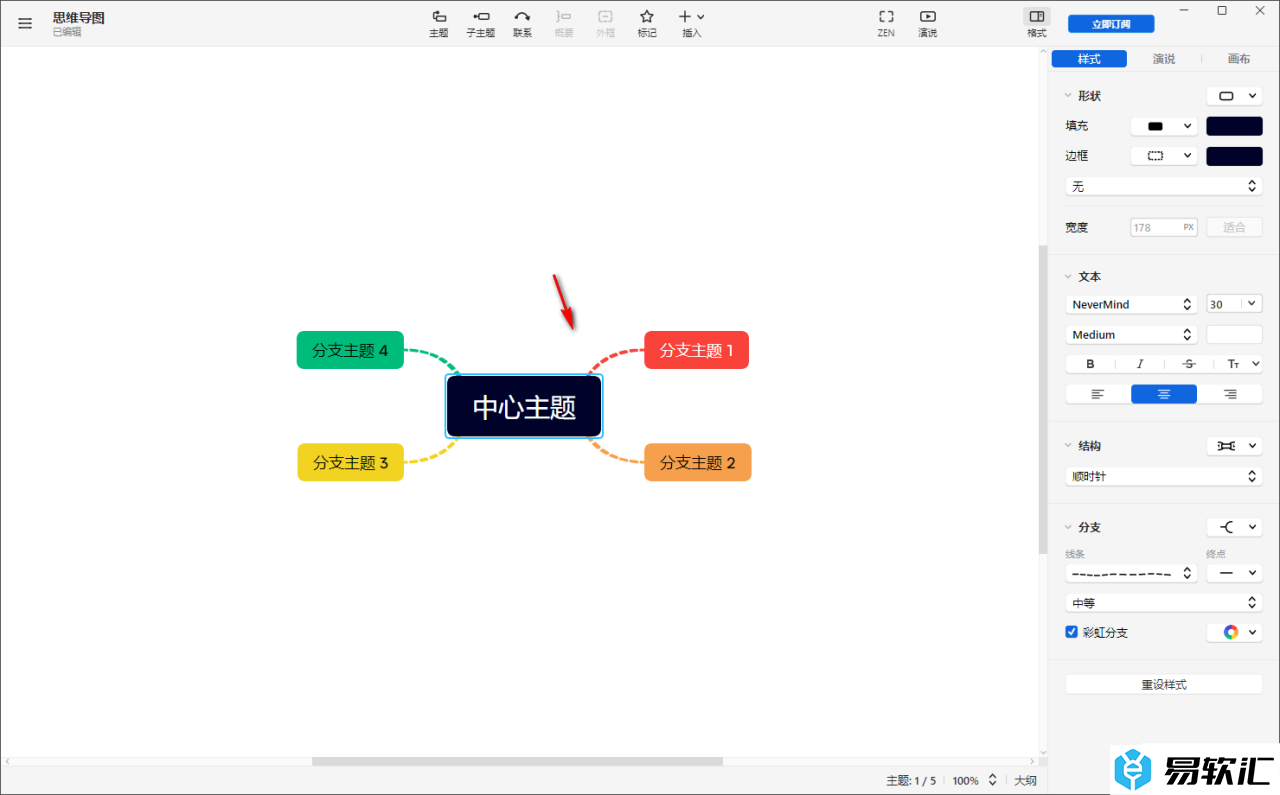 xmind是一款实用的思维导图编辑工具,在我们的电脑上安装这样一款思维导图软件的话,操作起来是很方便的,我们常常需要将一些需要的内容进行制作成思维导图的样式进行显示出来,那么我们可以通过选择一个思维导图模板样式进行相应的操作,其中有小伙伴想要将思维导图中的实线连线变成虚线曲线来显示,那么我们可以在样式窗口中进行更改设置即可,下方是关于如何使用Xmind思维导图将连线变成虚线的具体操作方法,如果你需要的情况下可以看看方法教程,希望小编的方法教程对大家有所帮助。