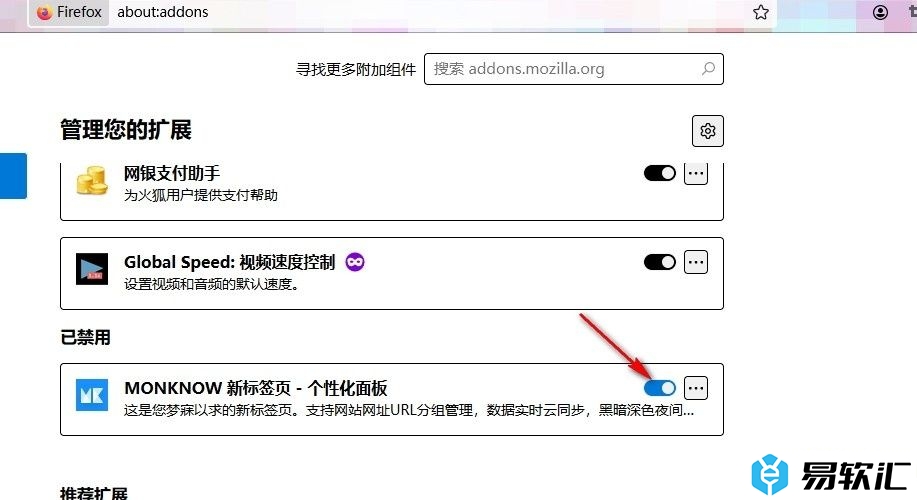 以上就是小编整理总结出的关于火狐浏览器添加的标签页插件无法使用的解决方法,我们先进入火狐浏览器的扩展管理页面,然后将标签页扩展的开关按钮打开,接着进入主页设置页面,然后将新标签页和主页都设置为自己需要的标签页扩展选项即可,感兴趣的小伙伴快去试试吧。